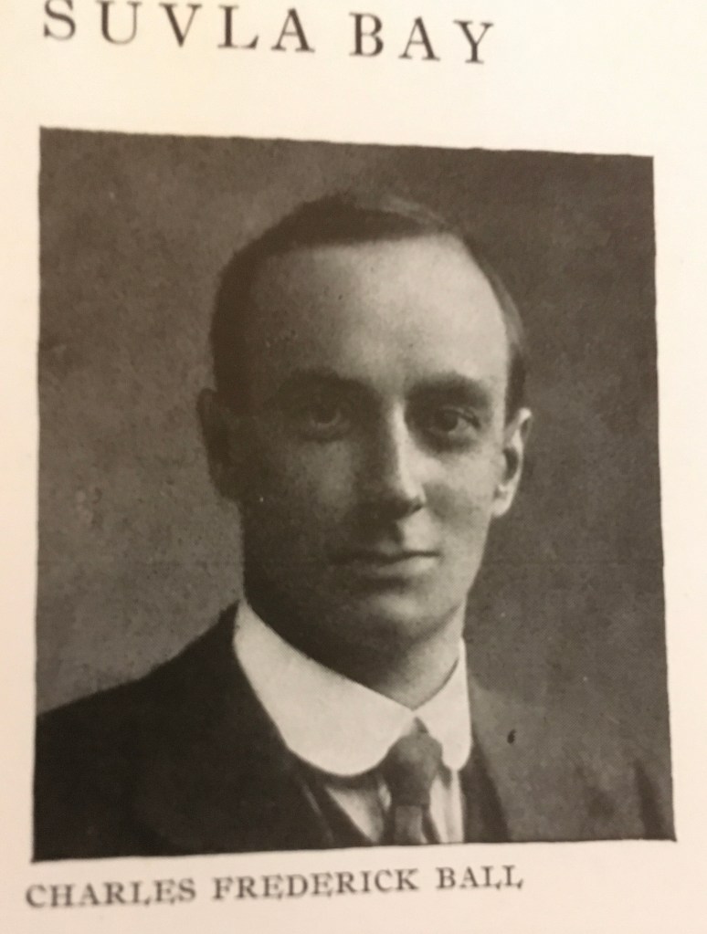 “As the days went by I began to hear of many of my friends who had gone under. My old Company was severely mauled after I left it, and among others my chief friend Ball was reported killed. While waiting on the beach with other sick (he was ill with dysentery) a shell fell near him and wounded one of his comrades. True to his nature he waited to help in the wounded man instead of rushing to cover. A second shell followed the first and he was struck in the back. In his weak condition he had not vitality to make a fight for life and died some hours later. He was buried by the sea. Thus very soon was fulfilled a presentiment he mentioned to me one day in Basingstoke, that he would not live to be very old, at which I then laughed. A silent and reserved Englishman, it did not take a long acquaintance to find the kindliness that lay behind his modest bearing, and the strength that made him a man not to be trifled with. It took longer to discover that he had already made a name for himself, and would have gone far in his calling had he not found a glorious end in Gallipoli. He was a friend on whom one might count for a lifetime.”