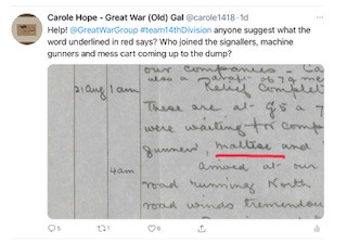 In the Founders’ Note to the second Salient Points journal of the Great War Group, we discover that there are nearly 150 volunteers working on the transcription project, of which I am one, working at a far slower pace than many others, but I am sure I am not the only tortoise!  It can be frustrating at times when the handwriting of a diary entry is illegible and calls often go out to Twitter with accompanying screenshots asking for help in deciphering a single word or more.  It is also the fact that there are variations of the level of detail and scarcity of information can be annoying.